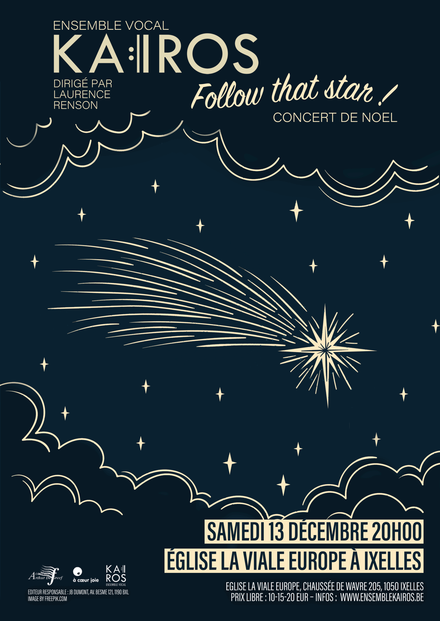 Pour son concert de Noël 2025, l’ensemble vocal Kaïros dirigé par Laurence Renson vous propose des chants porteurs d’espoir, puisés tant dans le répertoire traditionnel chrétien que dans l’univers jazzy du XXe siècle, ou encore parmi les créations contemporaines qui font vibrer les lumières de Noël aujourd’hui.